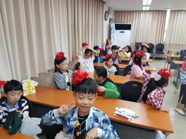 우리 친구들 조물조물 예쁘게 만들어서 머리에 꽂고 있는 모습이 너무 귀여웠어요